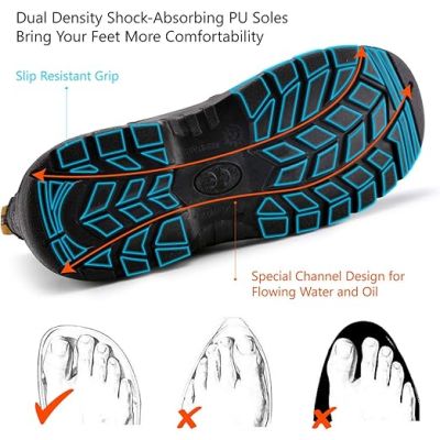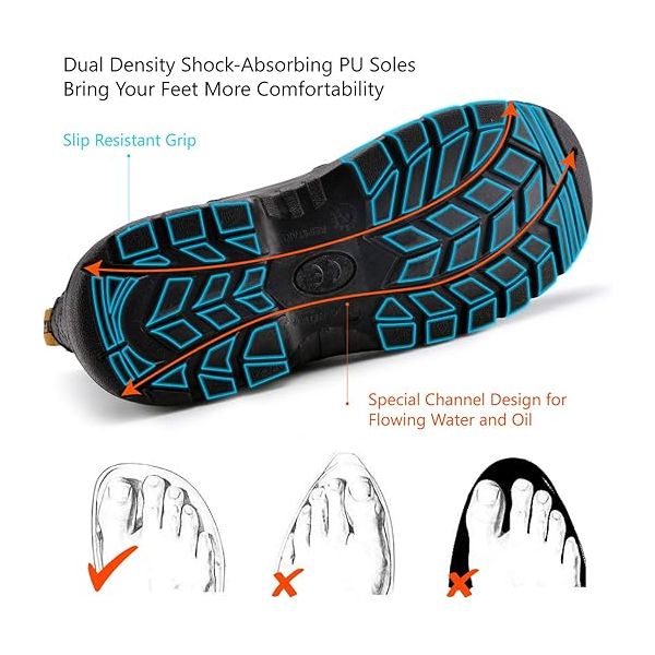 【SLIP & OIL RESISTANT 】: Work Boots out-sole are made of Oil and slip resistant dual density PU/Rubber , with SR standard, Anti-slip and Wear ,Heat Resistance. Meet needs of those who work in demanding environments. Relax and work confidently even on slippery surfaces with these slip & oil resistant safety Boots. Comfortable Support Contoured Footbed Provide Maximum Comfort and Support for your feet while stand on the workplace
