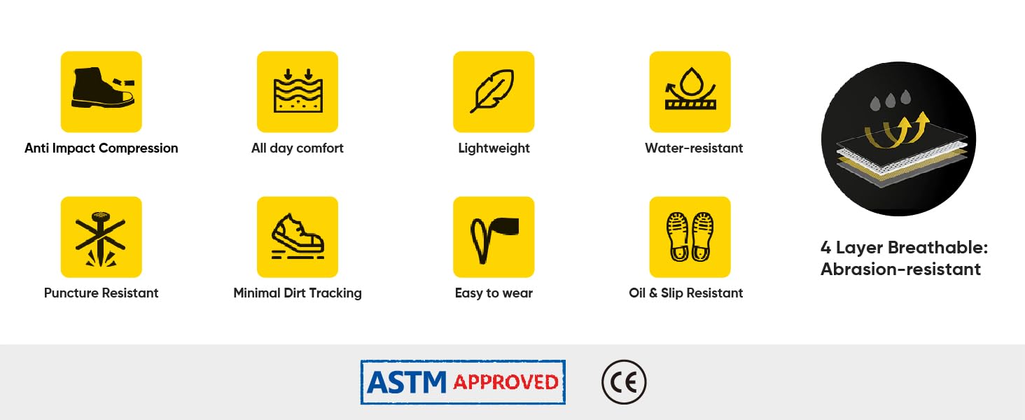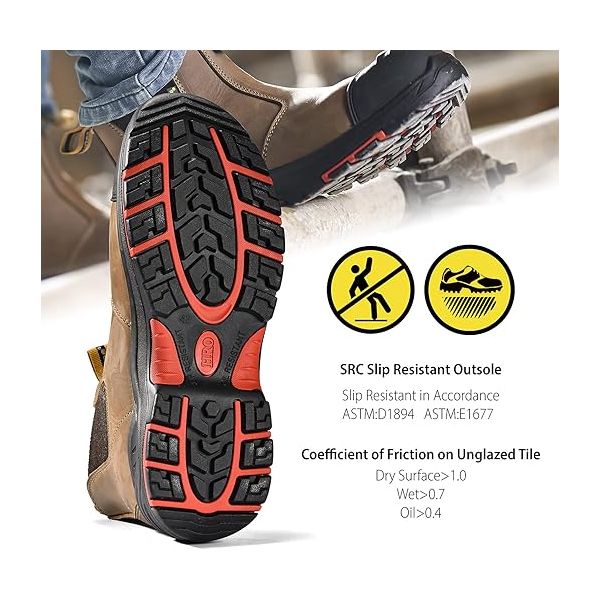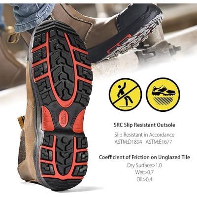 【CE & ASTM CERTIFICATION】: Keep your feet safe with mens steel toe boots, which are CE & ASTM approved and meet american standard. with steel toe cap offer wide fitting, inserted anti-nail midsole provide anti-puncture resistant performance, industrial construction safety work shoes keep worker in safety